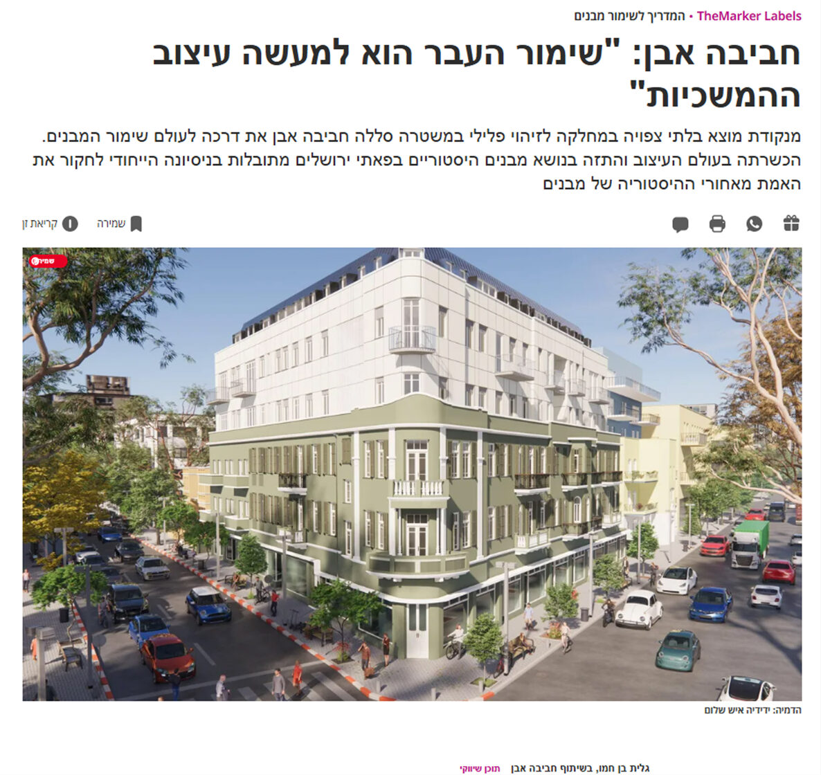 מנקודת מוצא בלתי צפויה במחלקה לזיהוי פלילי במשטרה סללה חביבה אבן את דרכה לעולם שימור המבנים. הכשרתה בעולם העיצוב והתזה בנושא מבנים היסטוריים בפאתי ירושלים מתובלות בניסיונה הייחודי לחקור את האמת מאחורי ההיסטוריה של מבנים.לקריאת הכתבה באתר TheMarker לחץ/י כאן.